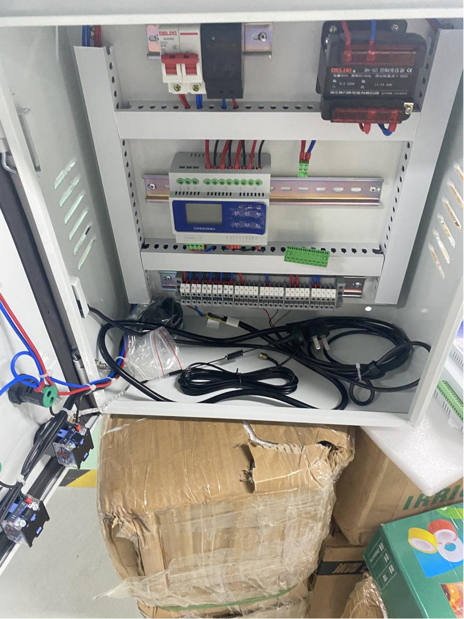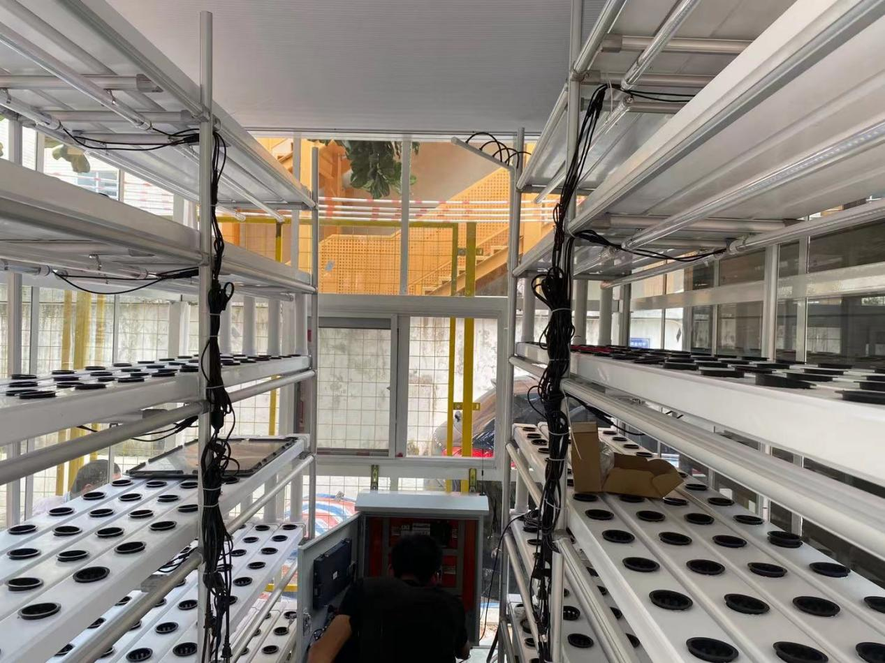 實施歷程:自2021年7月起,從第一臺設備進場到機柜裝調完畢,歷時兩個星期,設備涉及智能控制柜,降溫系統,溫度,濕度,光照傳感器,滴灌系統,以及光照補充設備實現控制或部分控制植物生長環境。