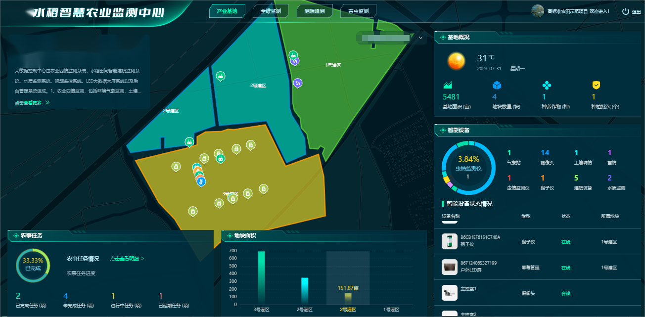 通過GIS二維地圖展示基地以及所在區(qū)域的地塊、農(nóng)作物、物聯(lián)網(wǎng)智能設(shè)備,可查看地塊、農(nóng)作物詳情、物聯(lián)網(wǎng)設(shè)備實時數(shù)據(jù)、歷史數(shù)據(jù)和實現(xiàn)設(shè)備遠(yuǎn)程操控。