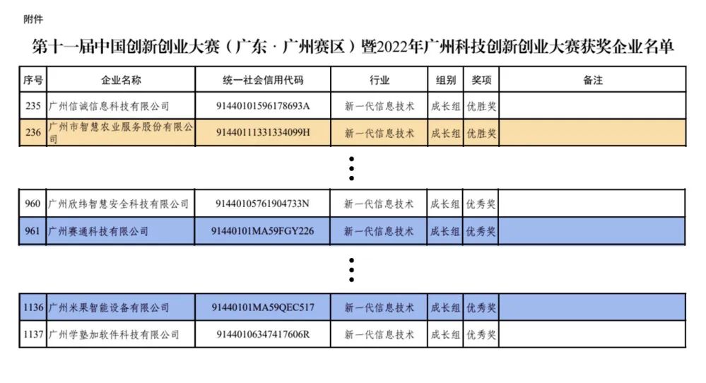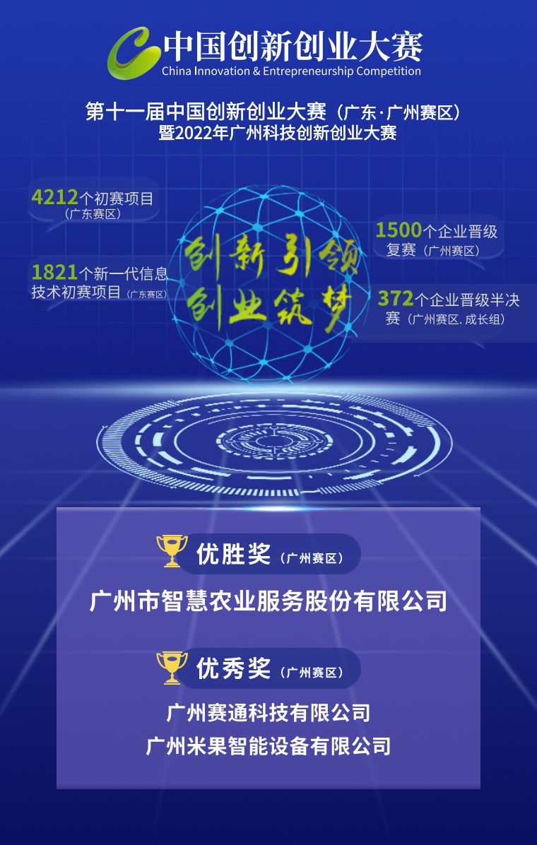 11月9日,經(jīng)過近四個月的激烈角逐和路演競賽,第十一屆中國創(chuàng)新創(chuàng)業(yè)大賽(廣東·廣州賽區(qū))暨2022年廣州科技創(chuàng)新創(chuàng)業(yè)大賽最終獲獎名單新鮮出爐。廣州市智慧農(nóng)業(yè)服務(wù)股份有限公司(以下簡稱“智慧農(nóng)業(yè)”)攜手子公司廣州賽通科技有限公司、廣州米果智能設(shè)備有限公司分別榮獲廣州賽區(qū)優(yōu)勝獎和優(yōu)秀獎。