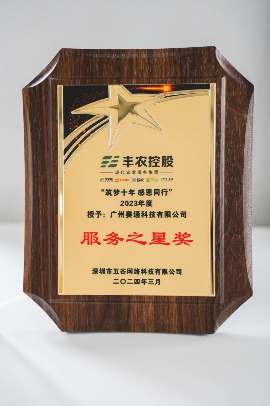 此前,深圳市豐農(nóng)控股(集團(tuán))有限公司舉辦“筑夢(mèng)十年 感恩同行”活動(dòng),授予廣州賽通科技有限公司“服務(wù)之星獎(jiǎng)”,對(duì)于我們?cè)?023年度作為供應(yīng)商提供的產(chǎn)品服務(wù)予以好評(píng)。