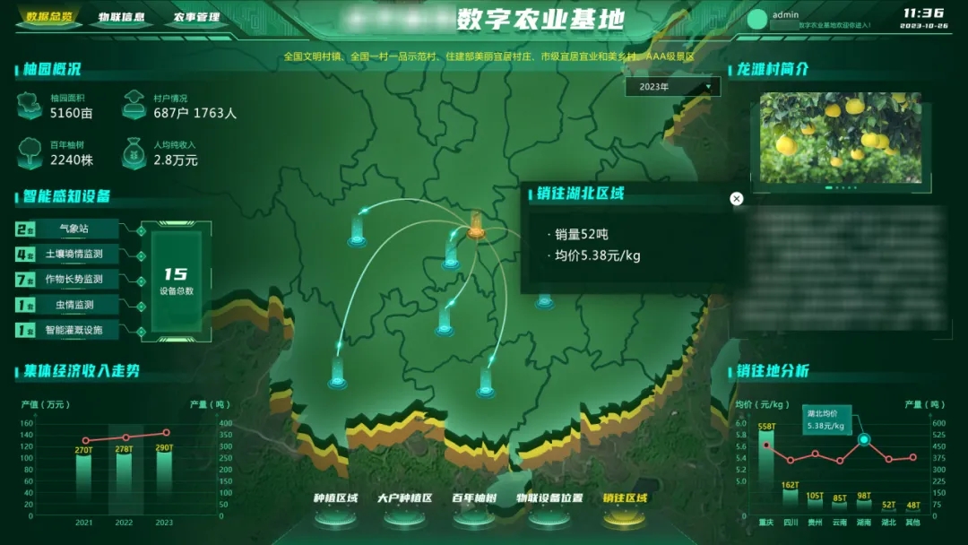 可視化大數據平臺:統籌種植區信息、物聯設備、農事任務等內容,可視化展示區域內設備狀態與控制、產品銷售溯源、農事計劃與管理等實時數據。