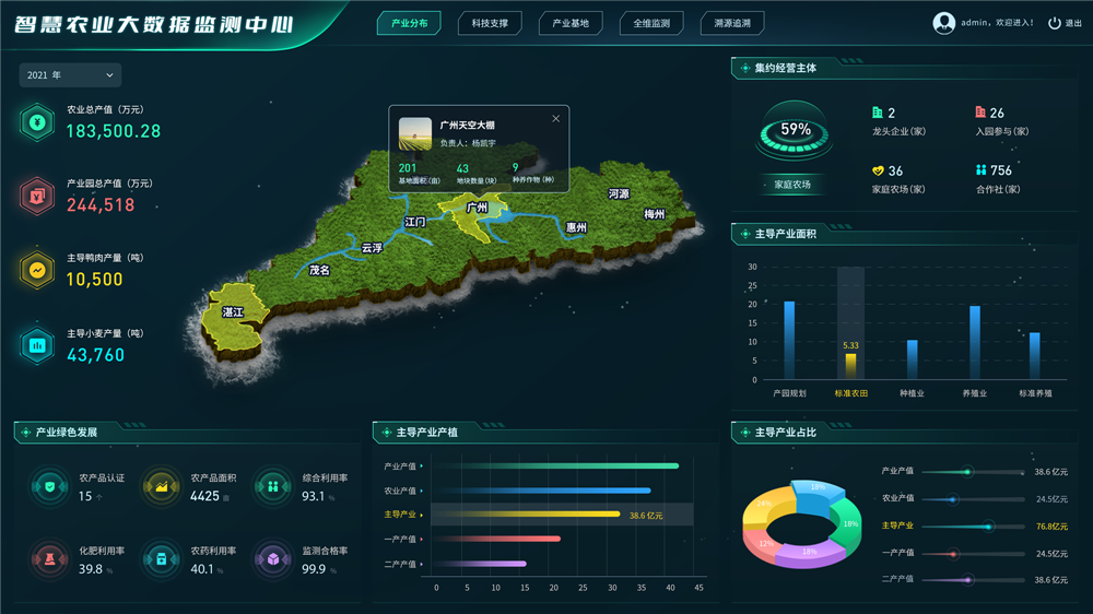 集合展示各年度主導產業產值、產業綠色發展、集約經營主體等動態數據情況。