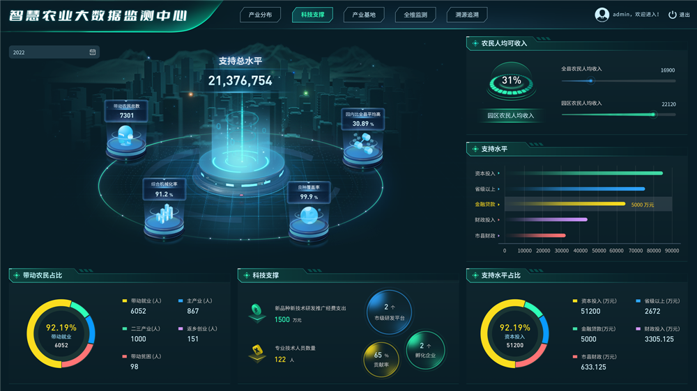 對科技支撐投入、帶動農戶、支持水平等數據進行綜合展示。