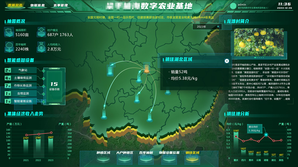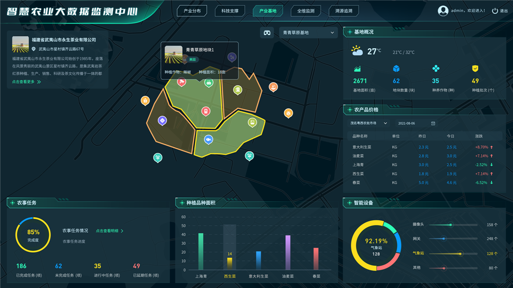 可視化基地概況、農事任務、種植面積、智能設備等基礎信息。