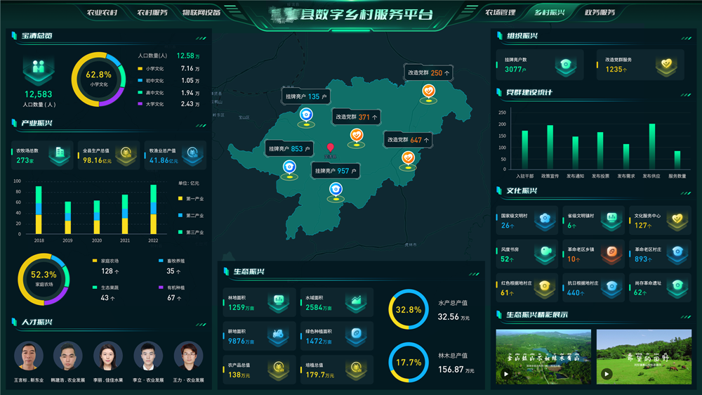 賽通科技根據不同的客戶群體和需求,提供可視化大數據監測中心的個性化定制解決方案,圍繞鄉村振興、美麗鄉村、政務服務、農場管理、產業支撐等主題需求展示可視化數據。