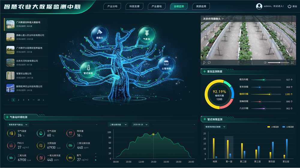 動態展示基地內的數據采集信息,包括氣象站、管式土壤墑情、監控設備、害蟲監測等,可一鍵點擊查看設備監測狀態。