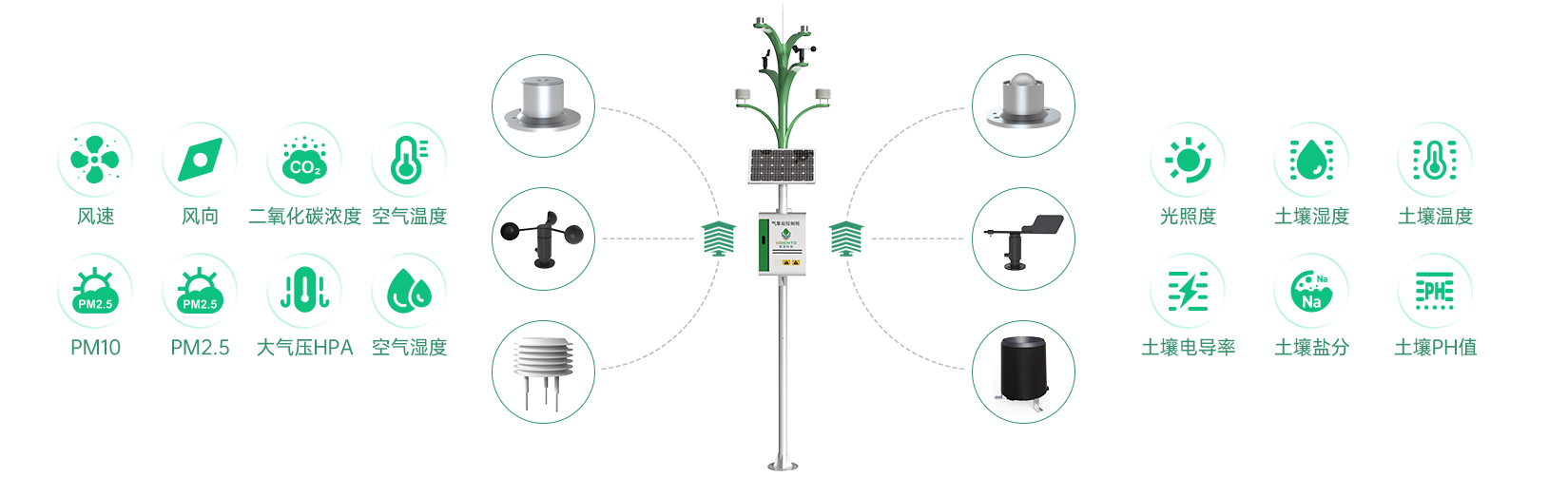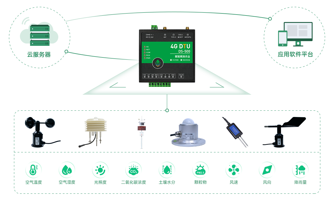 空氣濕度、光照強度、土壤溫度、土壤濕度、大氣壓力等氣象要素